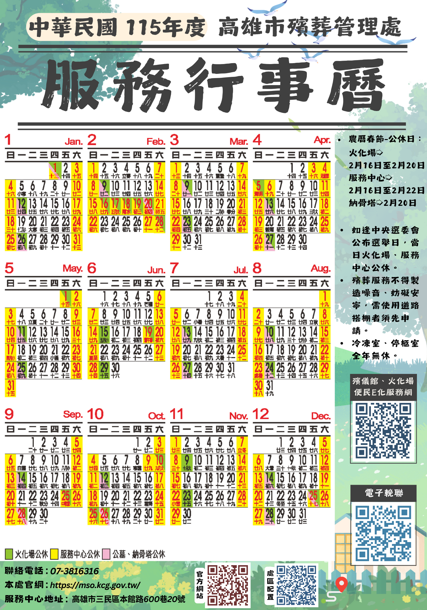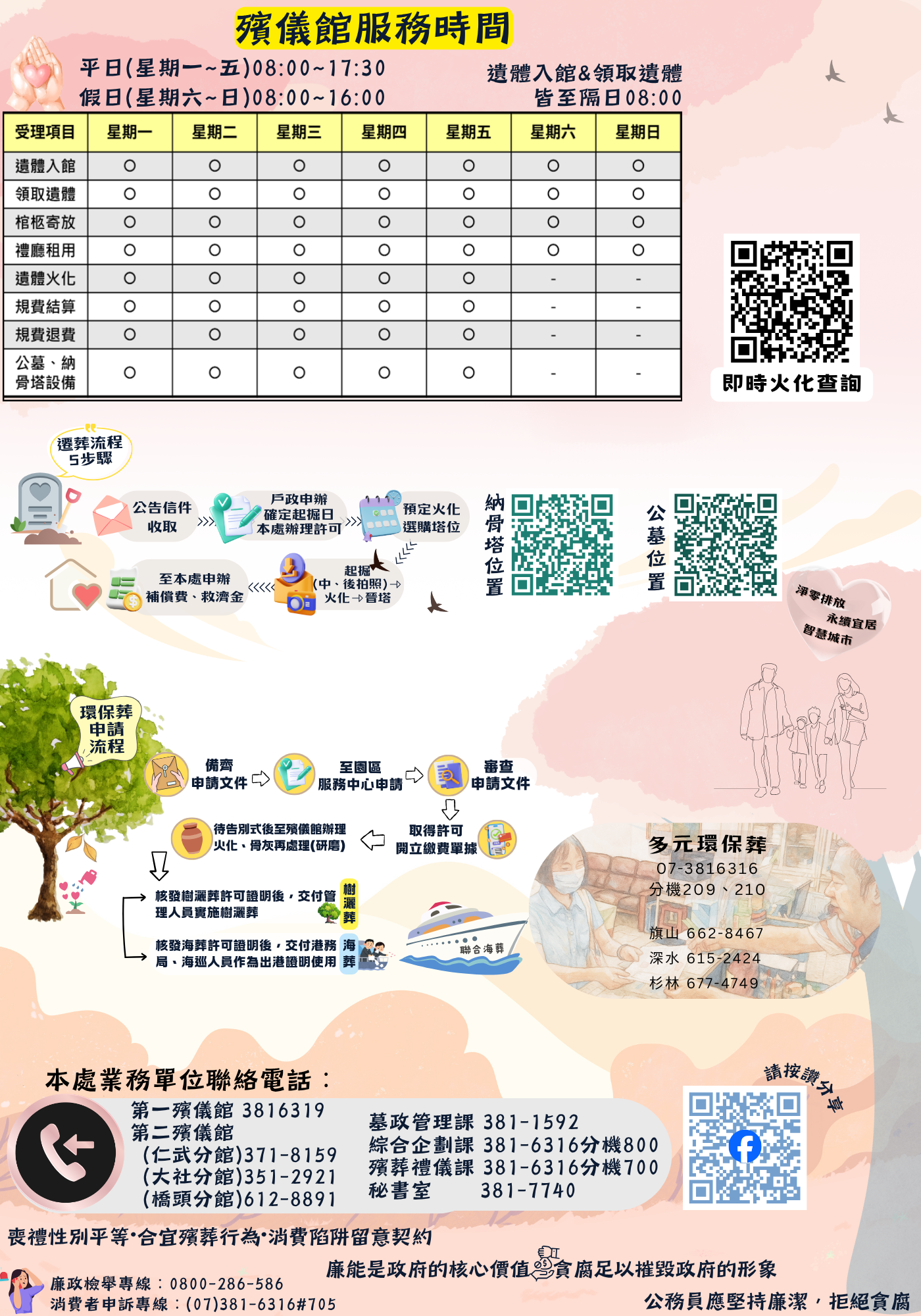 AM:8:00~12:00 PM:13:30~17:30 星期一、星期六、日AM8:00~PM16:00(國定放假日比照星期六日) 每月第二、四週的星期一配合火化場停爐公休、週一適逢農曆初一、十五正常服務、春節期間另行公告